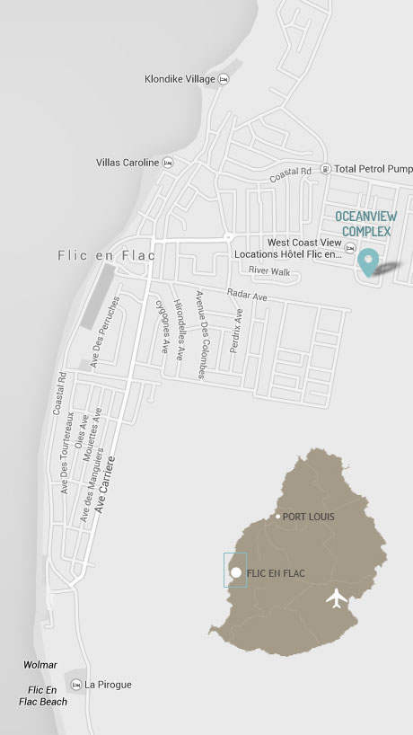 Our Oceanview complex is located along a small ravine, in a quiet neighborhood with great ocean and mountain views. The common facilities include a large swimming pool with beach-like features, resting kiosks, a kids pool, a tennis court and a club house (with fitness room, reception/conference area etc). An eco-friendly solar system provides natural water heating. The club house has a large balcony, offering panoramic views of Flic-en-Flac and the ocean, and memorable sunsets over the sea horizon. The complex is set within a lush tropical garden where local fruits (mangoes, litchis and bananas) are grown, and are available depending on the season!
