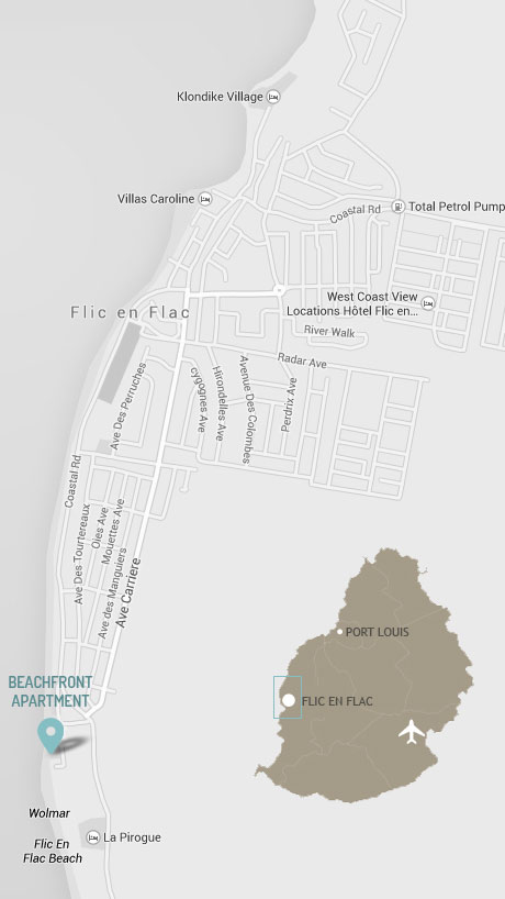 SSR International Airport is around a 45 minute drive. Located within easy reach of the main cities and business hubs such as Port-Louis, Quatre-Bornes, Rose-Hill and Ebène (all within a 35 minute drive). Upon request, we can organize airport transfers, excursions, car rental, taxi booking, catering service, golf booking etc.